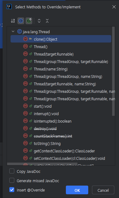 run이라는 메소드를 override해서 구현을 할 거다 컨트롤+o해서 고르면 된다.