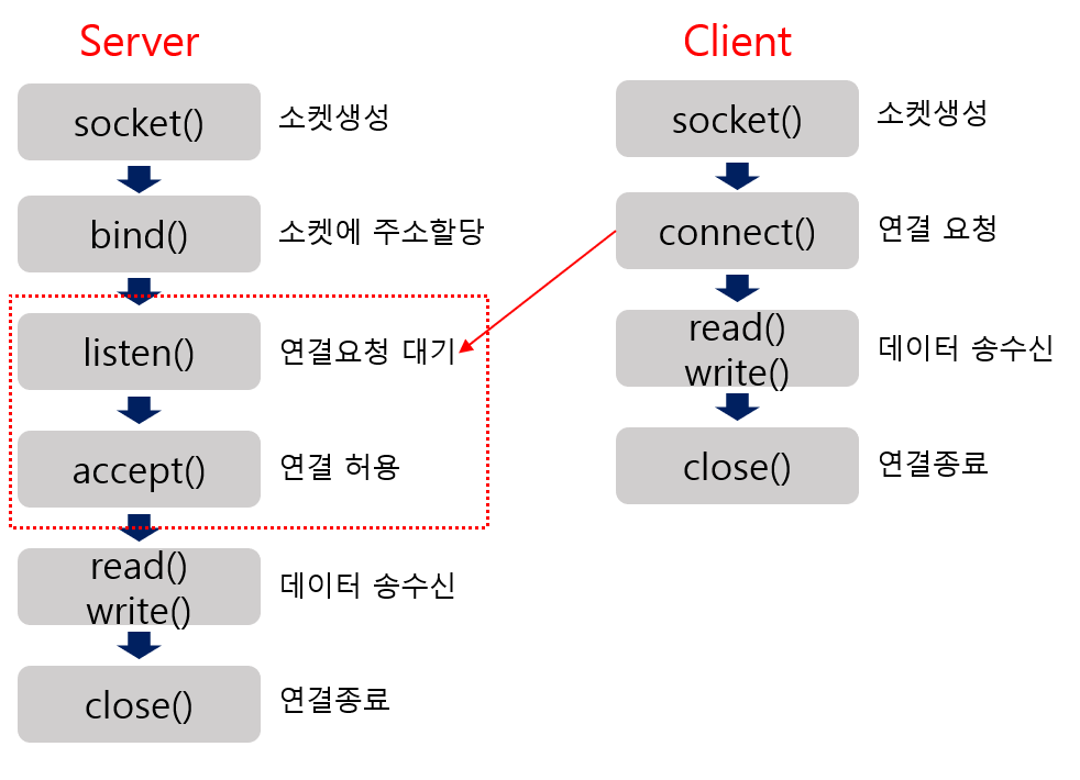 서버에서는 클라이언트가 접속을 보내면 accept를 사용하여 연결을 허용해준다.