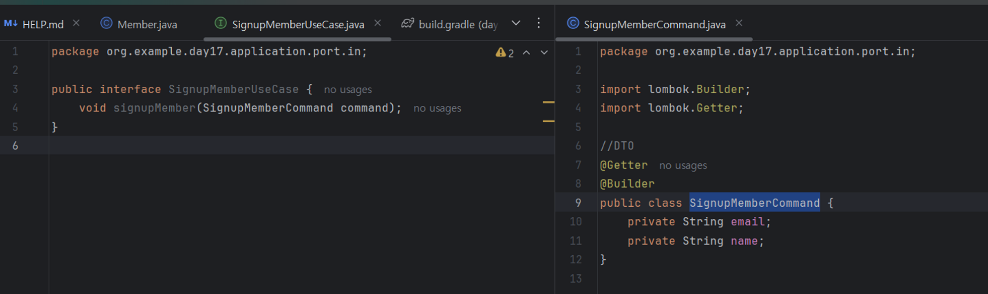 약간의 구조를 설명 하자면 입력 포트에 있는 UseCase는 Command를 웹 어댑터로부터 전달 받고 실행하는 것이다.