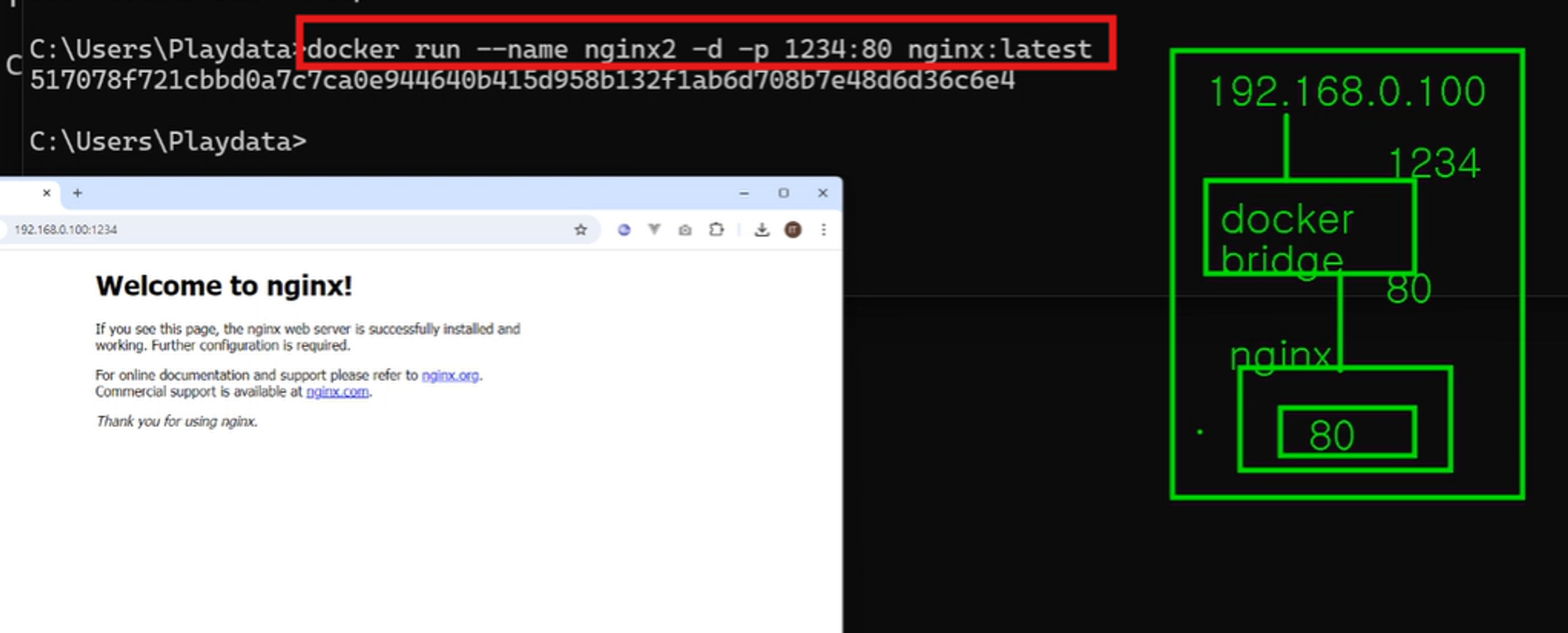 `docker run --name nginx -d -p 1234:80 nginx:latest` : **포트포워딩**